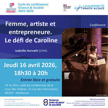 Pour la sixième conférence du cycle Science et Société 2025-26 de l’Université de Haute-Alsace et l’Université Populaire du Rhin, venez découvrir le défi de Caroline... Elle est artiste, entrepreneure, mais surtout femme...